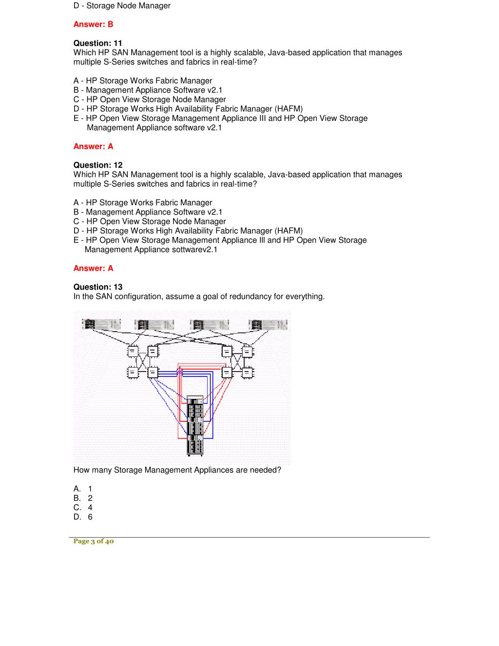D - Storage Node Manager Answer: B Question: 11 Which HP SAN Management tool is a highly scalable, Java-based application that manages multiple S-Series switches and fabrics in real-time? A - HP Storage Works Fabric Manager B - Management Appliance Software v2.1 C - HP Open View Storage Node Manager D - HP Storage Works High Availability Fabric Manager (HAFM) E - HP Open View Storage Management Appliance III and HP Open View Storage Management Appliance software v2.1 Answer: A Question: 12 Which HP SAN Management tool is a highly scalable, Java-based application that manages multiple S-Series switches and fabrics in real-time? A - HP Storage Works Fabric Manager B - Management Appliance Software v2.1 C - HP Open View Storage Node Manager D - HP Storage Works High Availability Fabric Manager (HAFM) E - HP Open View Storage Management Appliance Ill and HP Open View Storage Management Appliance sottwarev2.1 Answer: A Question: 13 In the SAN configuration, assume a goal of redundancy for everything. How many Storage Management Appliances are needed? A. 1 B. 2 C. 4 D. 6 Page 3 of 40