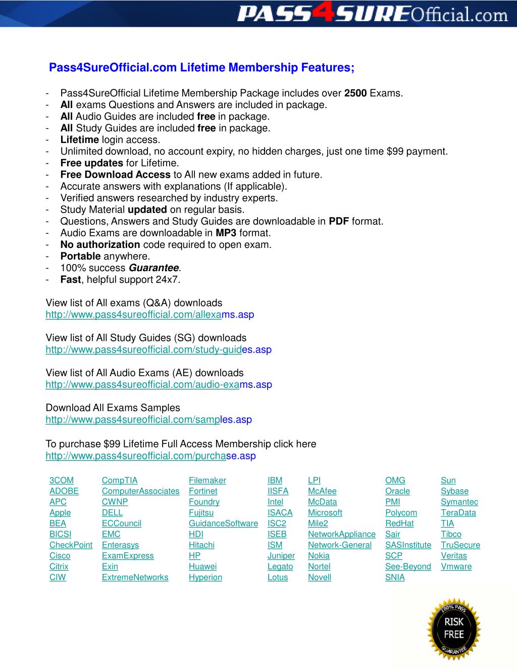 Pass4SureOfficial.com Lifetime Membership Features; - Pass4SureOfficial Lifetime Membership Package includes over 2500 Exams. - All exams Questions and Answers are included in package. - All Audio Guides are included free in package. - All Study Guides are included free in package. - Lifetime login access. - Unlimited download, no account expiry, no hidden charges, just one time $99 payment. - Free updates for Lifetime. - Free Download Access to All new exams added in future. - Accurate answers with explanations (If applicable). - Verified answers researched by industry experts. - Study Material updated on regular basis. - Questions, Answers and Study Guides are downloadable in PDF format. - Audio Exams are downloadable in MP3 format. - No authorization code required to open exam. - Portable anywhere. - 100% success Guarantee. - Fast, helpful support 24x7. View list of All exams (Q&A) downloads http://www.pass4sureofficial.com/allexams.asp View list of All Study Guides (SG) downloads http://www.pass4sureofficial.com/study-guides.asp View list of All Audio Exams (AE) downloads http://www.pass4sureofficial.com/audio-exams.asp Download All Exams Samples http://www.pass4sureofficial.com/samples.asp To purchase $99 Lifetime Full Access Membership click here http://www.pass4sureofficial.com/purchase.asp 3COM CompTIA Filemaker IBM LPI OMG Sun ADOBE ComputerAssociates Fortinet IISFA McAfee Oracle Sybase APC CWNP Foundry Intel McData PMI Symantec Apple DELL Fujitsu ISACA Microsoft Polycom TeraData BEA ECCouncil GuidanceSoftware ISC2 Mile2 RedHat TIA BICSI EMC HDI ISEB NetworkAppliance Sair Tibco CheckPoint Enterasys Hitachi ISM Network-General SASInstitute TruSecure Cisco ExamExpress HP Juniper Nokia SCP Veritas Citrix Exin Huawei Legato Nortel See-Beyond Vmware CIW ExtremeNetworks Hyperion Lotus Novell SNIA
