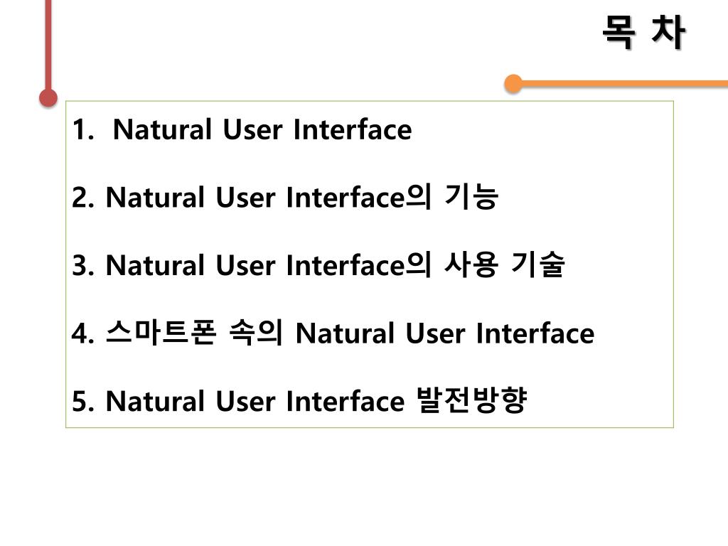 N.U.I (Natural User Interface). 컴퓨터 공학과 60072323 김원섭 60062409 홍원화. 목 차. Natural User Interface. GUI 와 NUI. - GUI (Graphical User Interface) GUI 는 그래픽을 통해 컴퓨터에 정보를 입력하는 환경을 말한다 . 마우스를 이용해 화면에 있는 그래픽화된 버튼 , 아이콘 같은 메뉴를 눌러 컴퓨터를 조작하는 현재의 컴퓨터 조작 방식이다. - NUI (Natural User Interface)