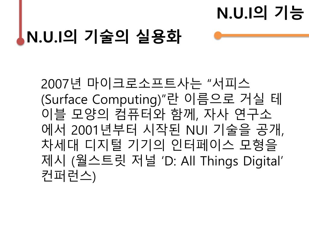 N.U.I의기능 N.U.I의 기술의 실용화 2007년 마이크로소프트사는 “서피스(Surface Computing)”란 이름으로거실테이블모양의컴퓨터와함께, 자사연구소에서 2001년부터 시작된 NUI 기술을공개, 차세대디지털기기의인터페이스모형을제시 (월스트릿저널 ‘D: All Things Digital’ 컨퍼런스)