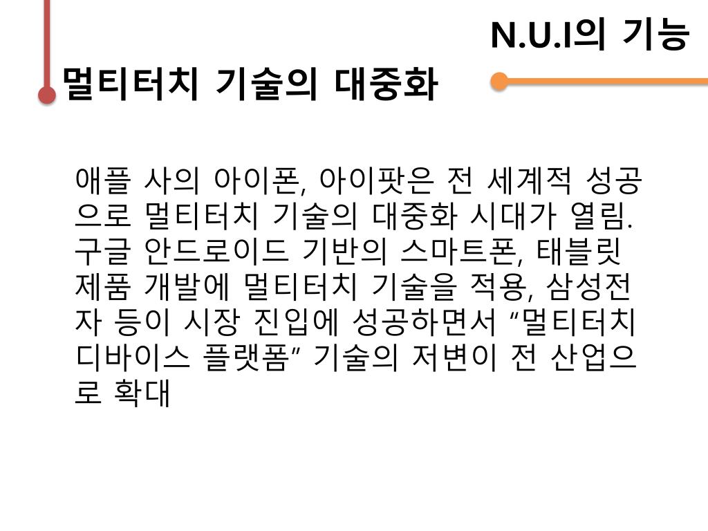 N.U.I의기능 멀티터치 기술의 대중화 애플 사의 아이폰, 아이팟은 전 세계적 성공으로 멀티터치 기술의 대중화 시대가 열림. 구글안드로이드 기반의 스마트폰, 태블릿 제품 개발에 멀티터치 기술을 적용, 삼성전자 등이 시장 진입에 성공하면서 “멀티터치 디바이스 플랫폼” 기술의 저변이 전 산업으로 확대