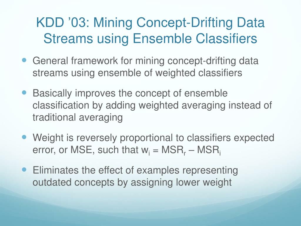 KDD ’03: Mining Concept-Drifting Data Streams using Ensemble Classifiers • General framework for mining concept-drifting data streams using ensemble of weighted classifiers • Basically improves the concept of ensemble classification by adding weighted averaging instead of traditional averaging • Weight is reversely proportional to classifiers expected error, or MSE, such that wi = MSRr – MSRi • Eliminates the effect of examples representing outdated concepts by assigning lower weight