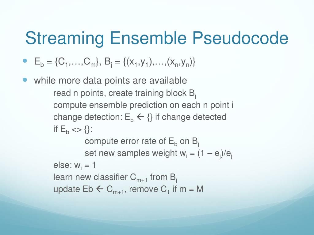 Streaming Ensemble Pseudocode • Eb = {C1,…,Cm}, Bj = {(x1,y1),…,(xn,yn)} • while more data points are available read n points, create training block Bj compute ensemble prediction on each n point i change detection: Eb {} if change detected if Eb <> {}: compute error rate of Eb on Bj set new samples weight wi = (1 – ej)/ej else: wi = 1 learn new classifier Cm+1 from Bj update Eb Cm+1, remove C1 if m = M