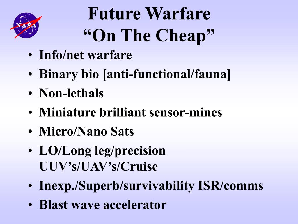 Future Warfare“On The Cheap” • Info/net warfare • Binary bio [anti-functional/fauna] • Non-lethals • Miniature brilliant sensor-mines • Micro/Nano Sats • LO/Long leg/precision UUV’s/UAV’s/Cruise • Inexp./Superb/survivability ISR/comms • Blast wave accelerator