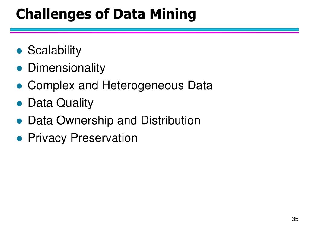 Challenges of Data Mining • Scalability • Dimensionality • Complex and Heterogeneous Data • Data Quality • Data Ownership and Distribution • Privacy Preservation