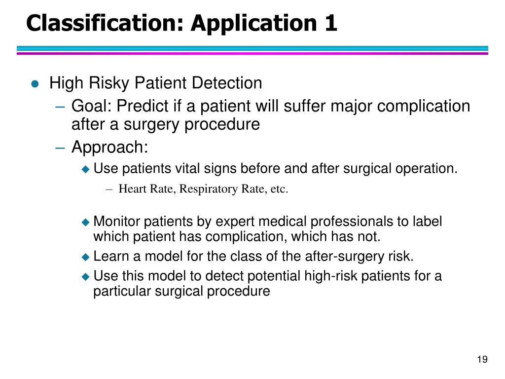 Classification: Application 1 • High Risky Patient Detection • Goal: Predict if a patient will suffer major complication after a surgery procedure • Approach: • Use patients vital signs before and after surgical operation. • Heart Rate, Respiratory Rate, etc. • Monitor patients by expert medical professionals to label which patient has complication, which has not. • Learn a model for the class of the after-surgery risk. • Use this model to detect potential high-risk patients for a particular surgical procedure