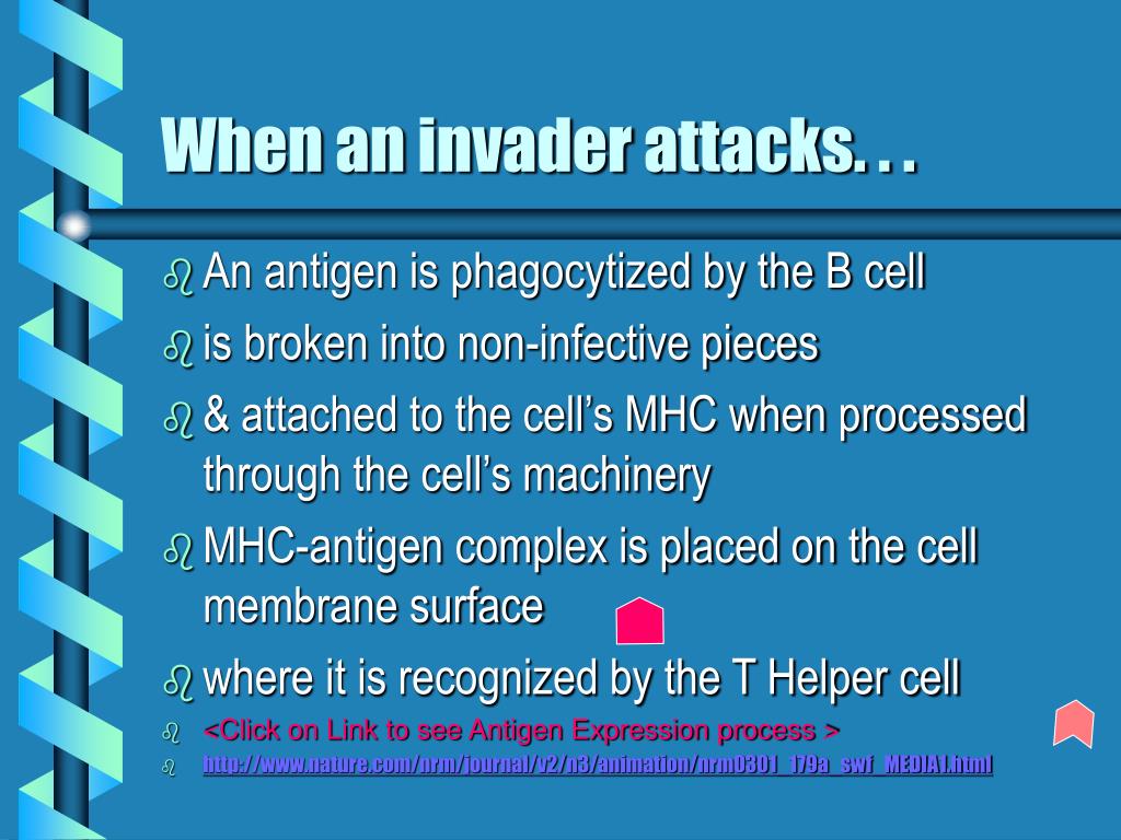 When an invader attacks. . . • An antigen is phagocytized by the B cell • is broken into non-infective pieces • & attached to the cell’s MHC when processed through the cell’s machinery • MHC-antigen complex is placed on the cell membrane surface • where it is recognized by the T Helper cell • <Click on Link to see Antigen Expression process > • http://www.nature.com/nrm/journal/v2/n3/animation/nrm0301_179a_swf_MEDIA1.html