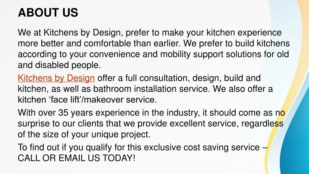 ABOUT US We at Kitchens by Design, prefer to make your kitchen experience more better and comfortable than earlier. We prefer to build kitchens according to your convenience and mobility support solutions for old and disabled people. Kitchens by Design offer a full consultation, design, build and kitchen, as well as bathroom installation service. We also offer a kitchen ‘face lift’/makeover service. With over 35 years experience in the industry, it should come as no surprise to our clients that we provide excellent service, regardless of the size of your unique project. To find out if you qualify for this exclusive cost saving service – CALL OR EMAIL US TODAY!