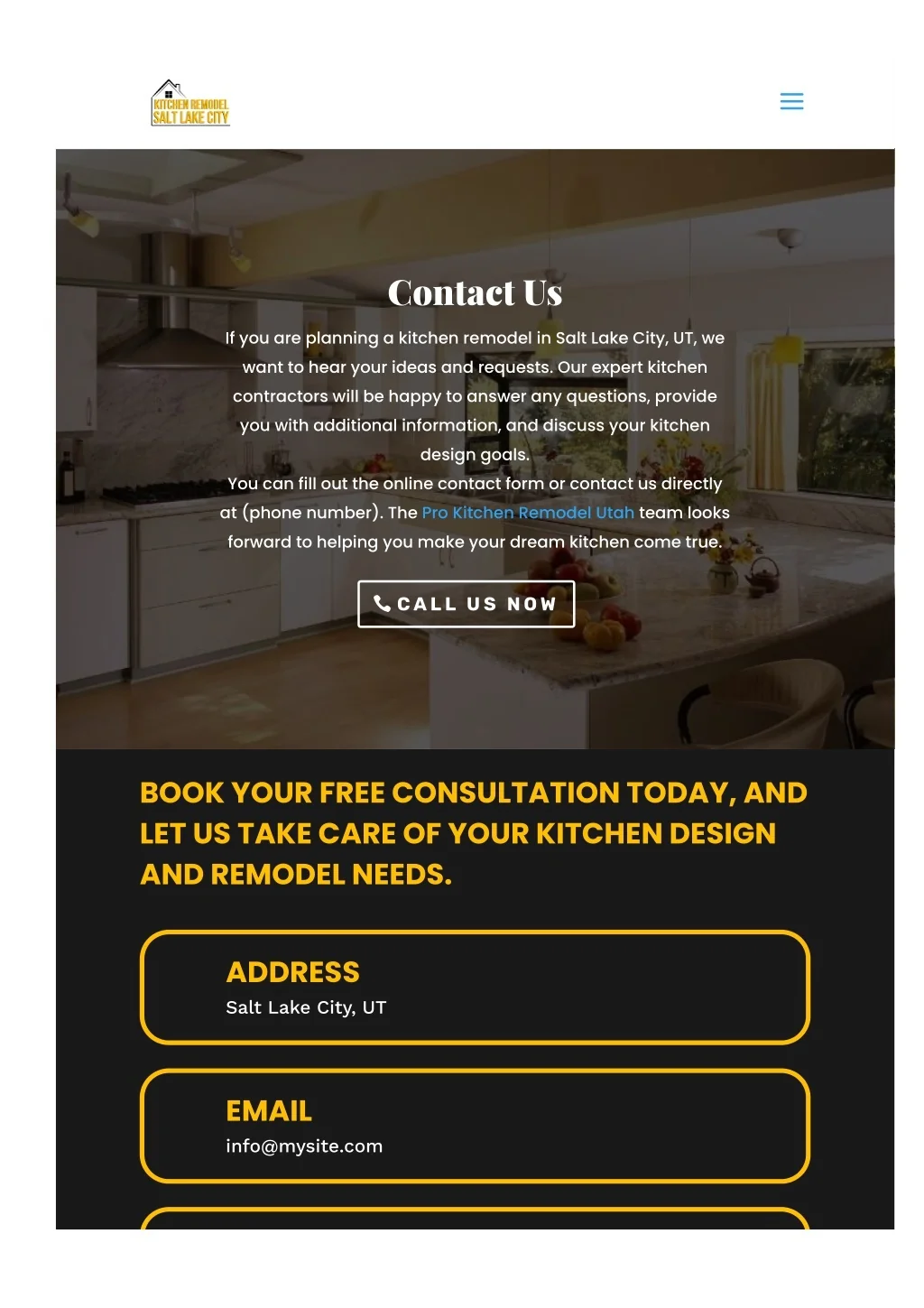 a Contact Us If you are planning a kitchen remodel in Salt Lake City, UT, we want to hear your ideas and requests. Our expert kitchen contractors will be happy to answer any questions, provide you with additional information, and discuss your kitchen design goals. You can fill out the online contact form or contact us directly at (phone number). The Pro Kitchen Remodel Utah team looks forward to helping you make your dream kitchen come true. CALL US NOW BOOK YOUR FREE CONSULTATION TODAY, AND LET US TAKE CARE OF YOUR KITCHEN DESIGN AND REMODEL NEEDS. ADDRESS Salt Lake City, UT EMAIL info@mysite.com