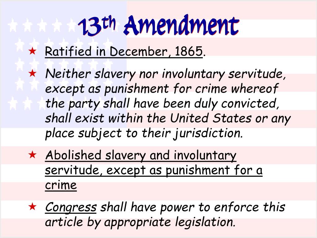 13th Amendment • Ratified in December, 1865. • Neither slavery nor involuntary servitude, except as punishment for crime whereof the party shall have been duly convicted, shall exist within the United States or any place subject to their jurisdiction. • Abolished slavery and involuntary servitude, except as punishment for a crime • Congress shall have power to enforce this article by appropriate legislation.