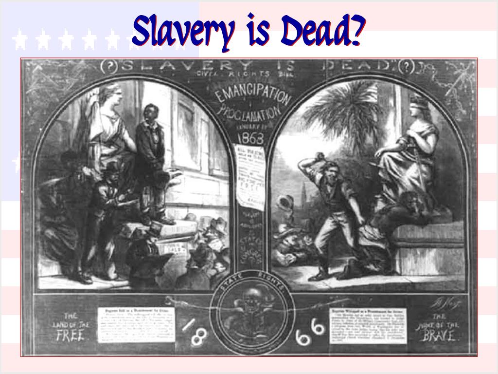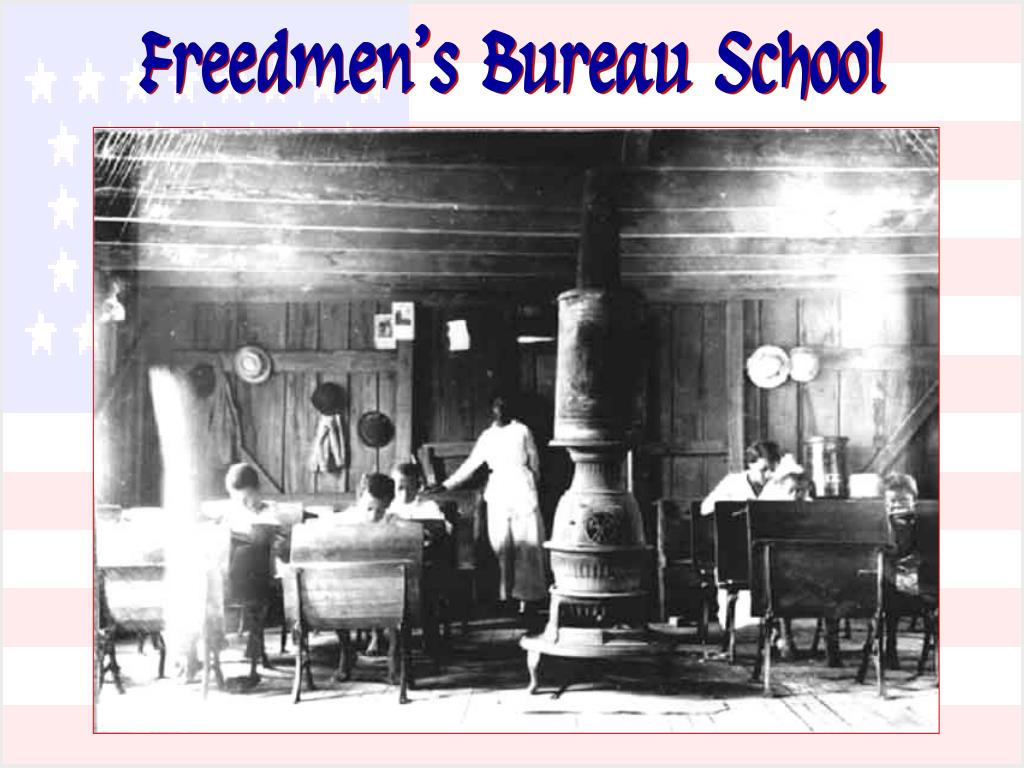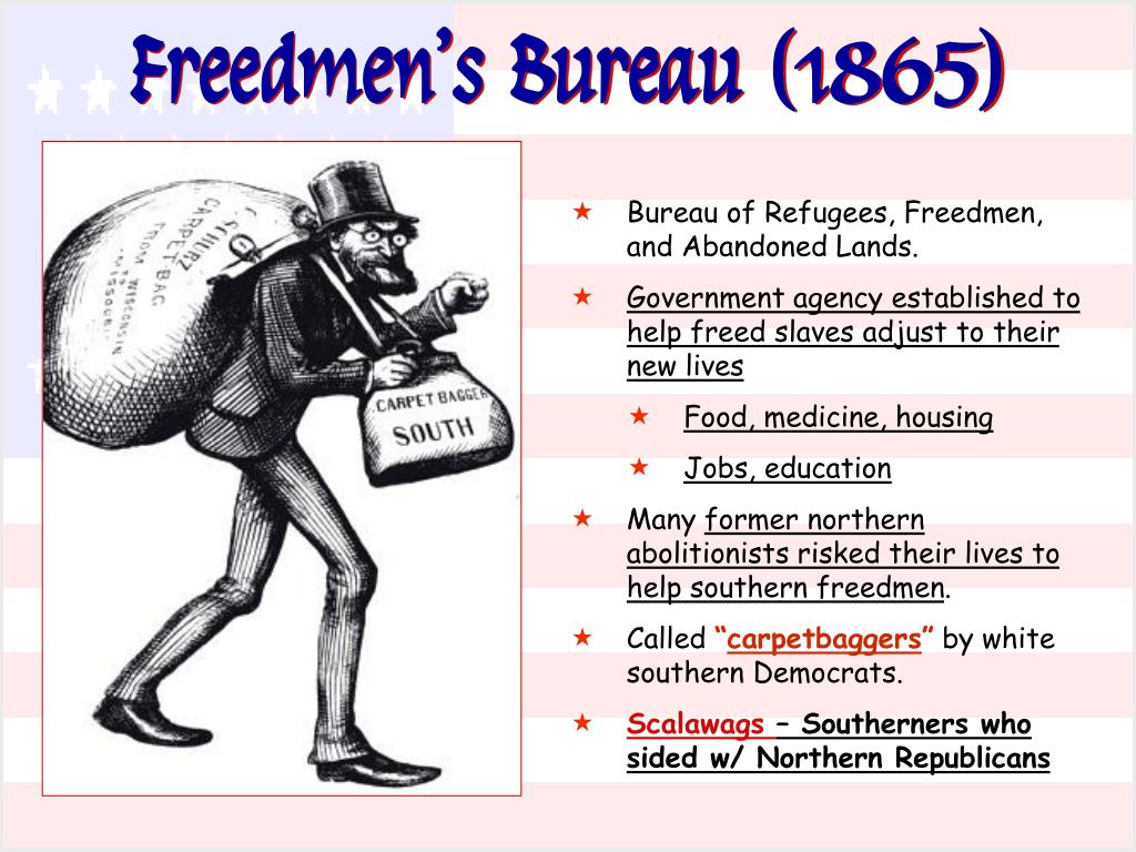Freedmen’s Bureau (1865) • Bureau of Refugees, Freedmen, and Abandoned Lands. • Government agency established to help freed slaves adjust to their new lives • Food, medicine, housing • Jobs, education • Many former northern abolitionists risked their lives to help southern freedmen. • Called “carpetbaggers” by white southern Democrats. • Scalawags – Southerners who sided w/ Northern Republicans