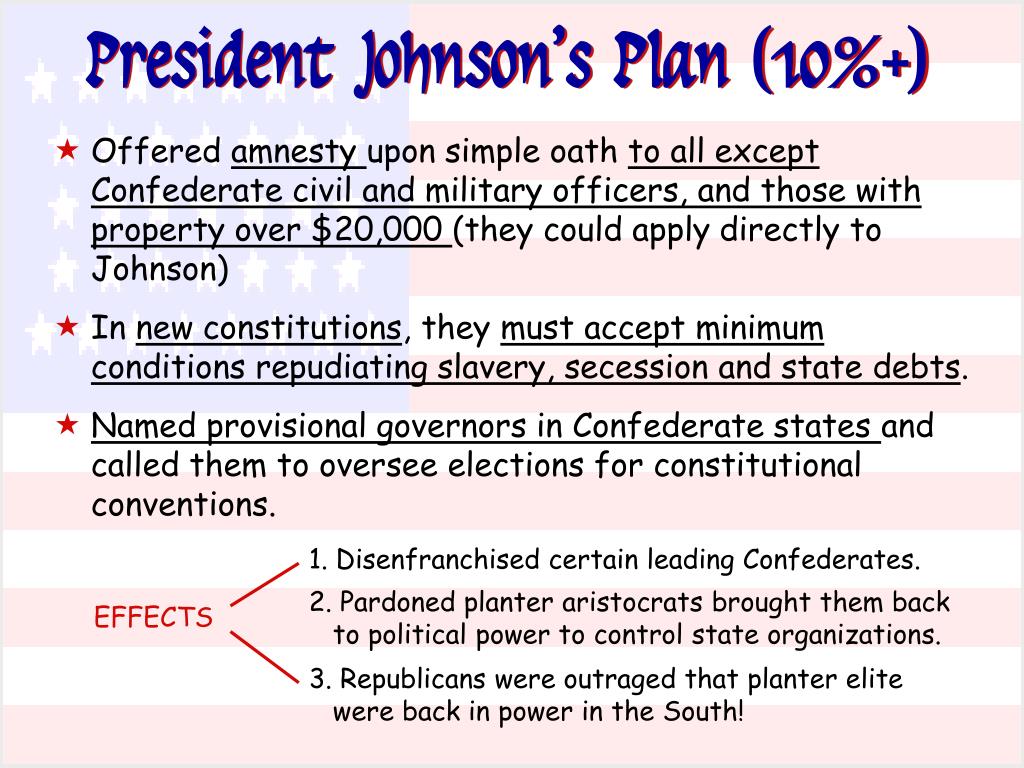 President Johnson’s Plan (10%+) • Offered amnesty upon simple oath to all except Confederate civil and military officers, and those with property over $20,000 (they could apply directly to Johnson) • In new constitutions, they must accept minimumconditions repudiating slavery, secession and state debts. • Named provisional governors in Confederate states and called them to oversee elections for constitutional conventions. 1. Disenfranchised certain leading Confederates. 2. Pardoned planter aristocrats brought them back to political power to control state organizations. EFFECTS 3. Republicans were outraged that planter elite were back in power in the South!