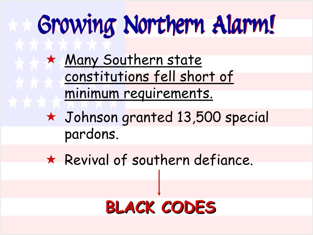 Growing Northern Alarm! • Many Southern state constitutions fell short of minimum requirements. • Johnson granted 13,500 special pardons. • Revival of southern defiance. BLACK CODES