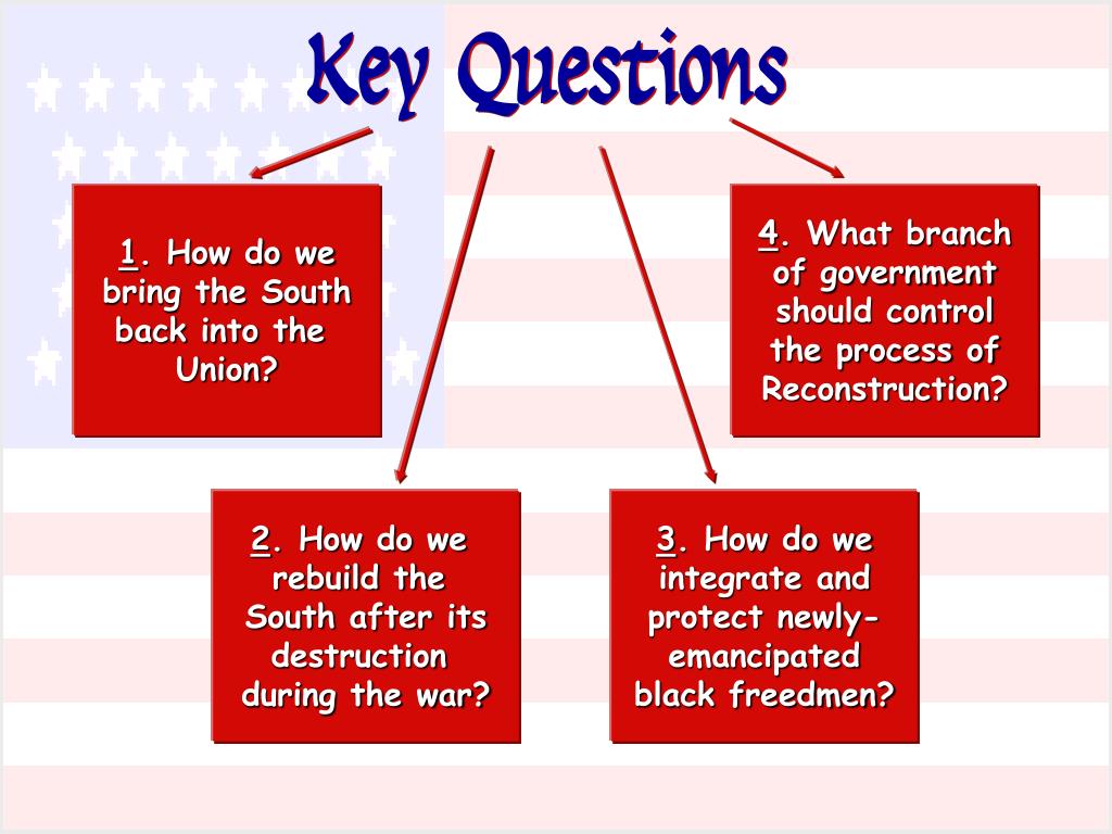 Key Questions 1. How do webring the Southback into the Union? 4. What branchof governmentshould controlthe process ofReconstruction? 2. How do we rebuild the South after itsdestruction during the war? 3. How do weintegrate andprotect newly-emancipatedblack freedmen?
