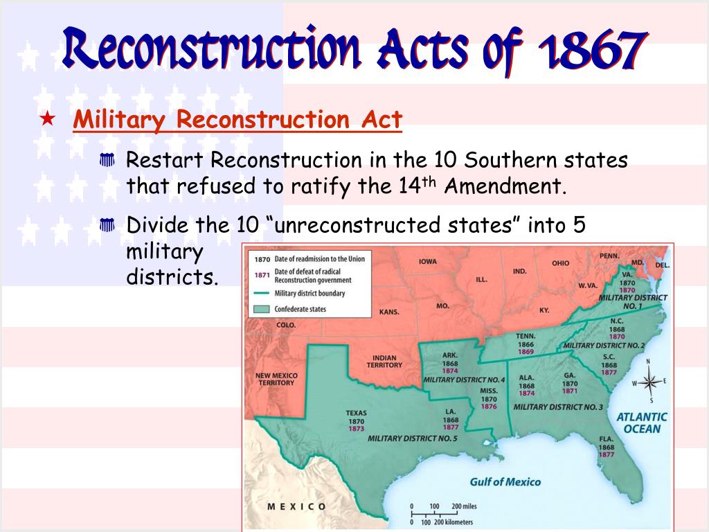 Reconstruction Acts of 1867 • Military Reconstruction Act • Restart Reconstruction in the 10 Southern states that refused to ratify the 14th Amendment. • Divide the 10 “unreconstructed states” into 5 military districts.