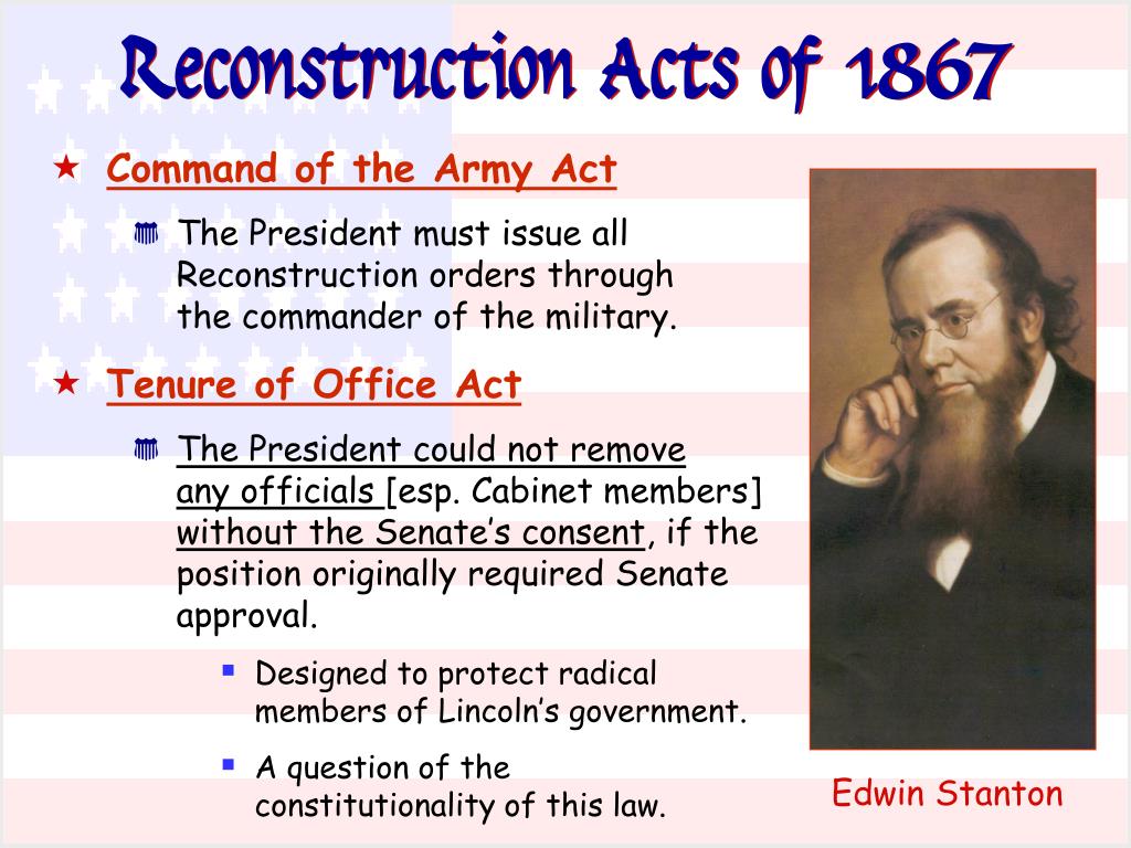 Reconstruction Acts of 1867 • Command of the Army Act • The President must issue all Reconstruction orders through the commander of the military. • Tenure of Office Act • The President could not remove any officials [esp. Cabinet members] without the Senate’s consent, if the position originally required Senate approval. • Designed to protect radicalmembers of Lincoln’s government. • A question of the constitutionality of this law. Edwin Stanton