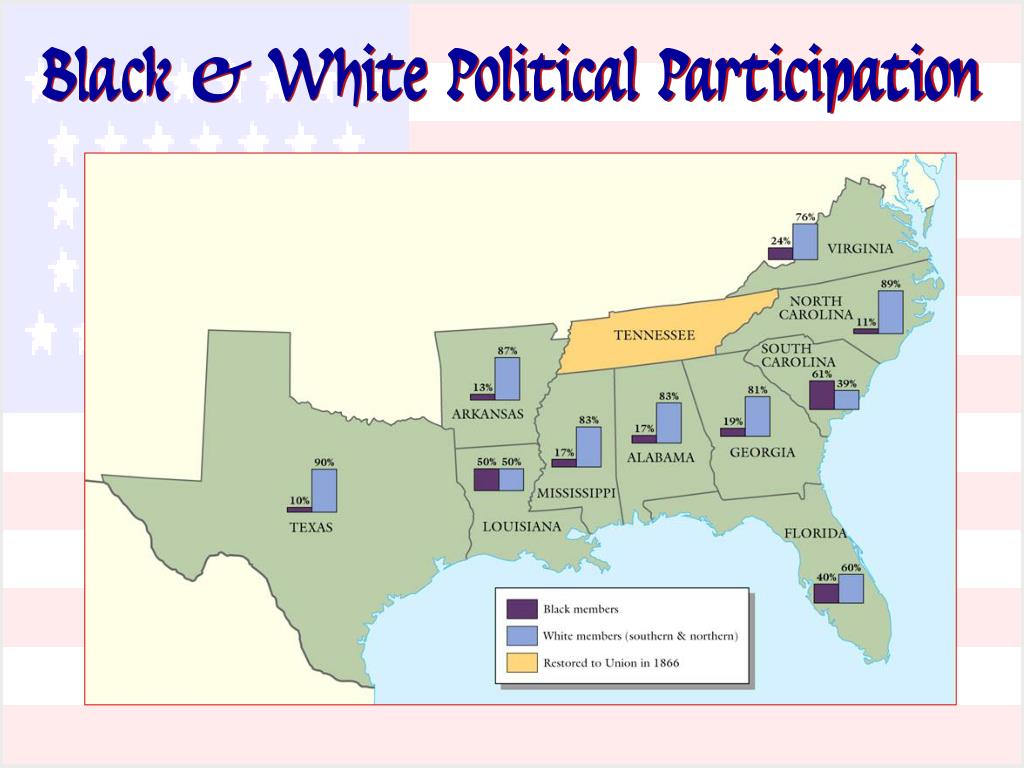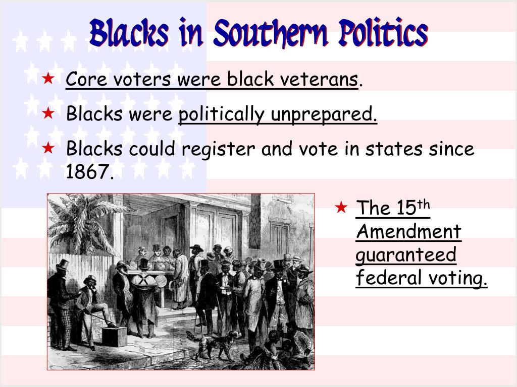 Blacks in Southern Politics • Core voters were black veterans. • Blacks were politically unprepared. • Blacks could register and vote in states since 1867. • The 15th Amendment guaranteedfederal voting.