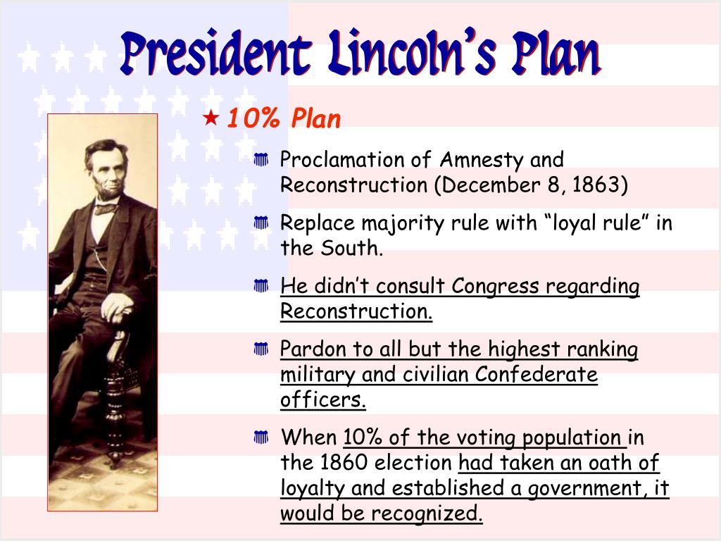 President Lincoln’s Plan • 10% Plan • Proclamation of Amnesty and Reconstruction (December 8, 1863) • Replace majority rule with “loyal rule” in the South. • He didn’t consult Congress regarding Reconstruction. • Pardon to all but the highest ranking military and civilian Confederate officers. • When 10% of the voting population in the 1860 election had taken an oath of loyalty and established a government, it would be recognized.