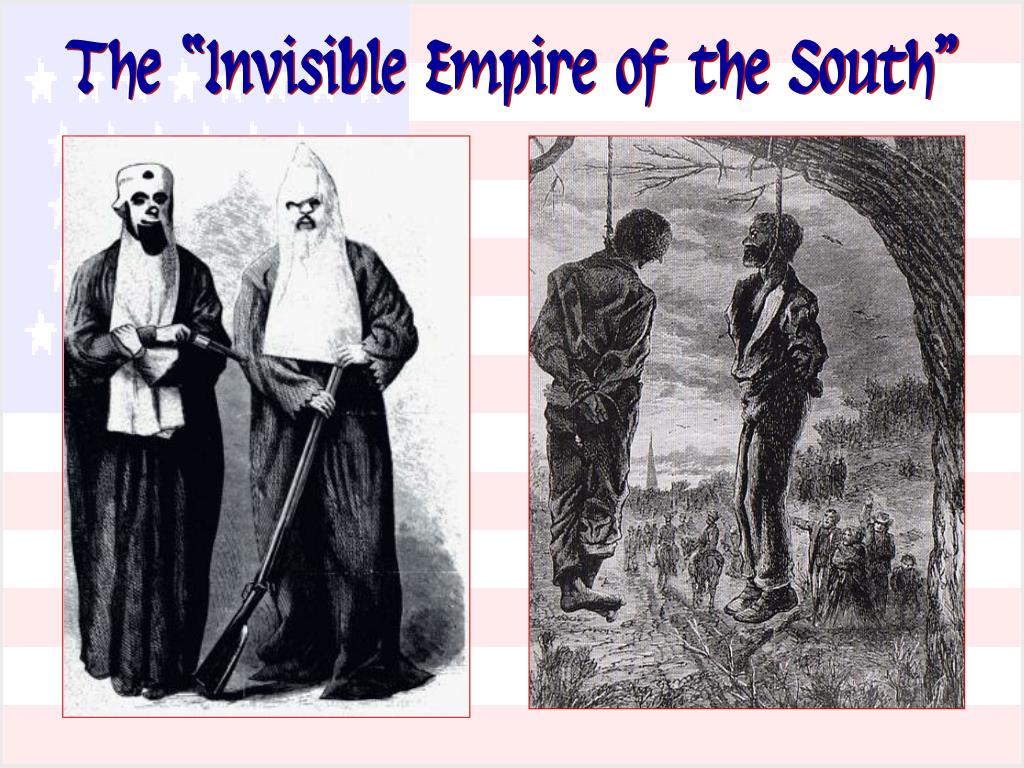 Ku Klux Klan (KKK) • Organization formed to restore white supremacy in the South • Resorted to violence, terrorism, and intimidation to further their goals • Planned to restore white supremacy by stopping African Americans from exercising their political rights • By 1868, the KKK existed in nearly every Southern state