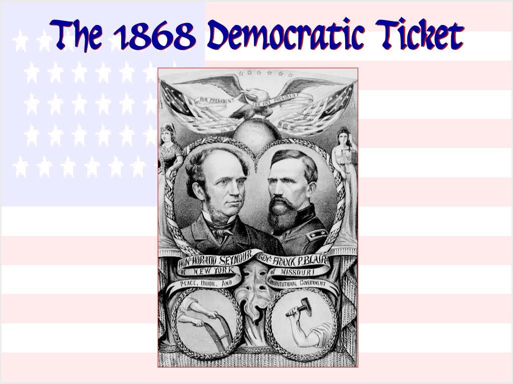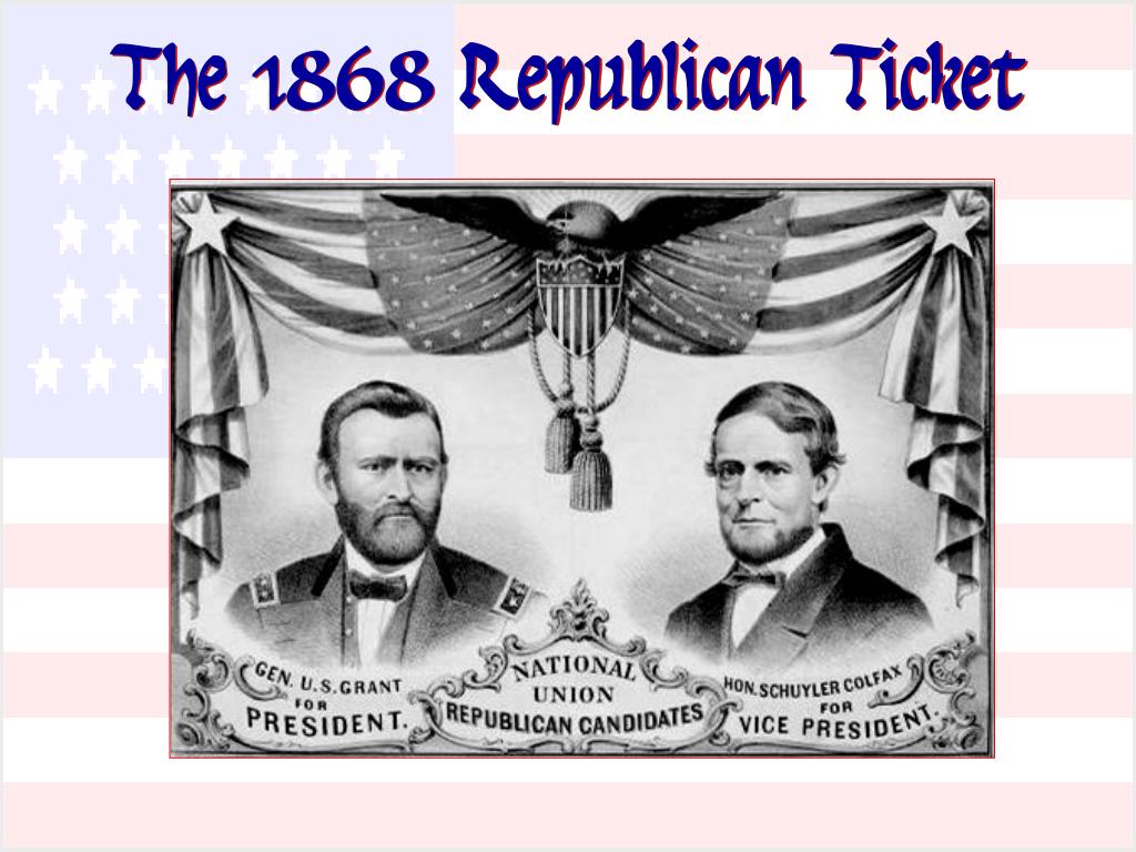 Radical Plan for Readmission • Civil authorities in the territories were subject to military supervision. • Required new state constitutions, includingblack suffrage and ratification of the 13th and 14th Amendments. • In March, 1867, Congress passed an act that authorized the military to enroll eligible black voters and begin the process of constitution making.