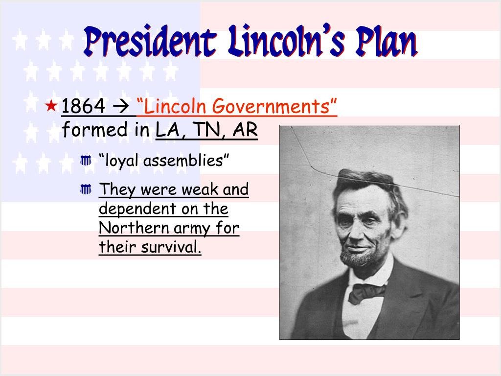 President Lincoln’s Plan • 1864 “Lincoln Governments”formed in LA, TN, AR • “loyal assemblies” • They were weak and dependent on the Northern army for their survival.