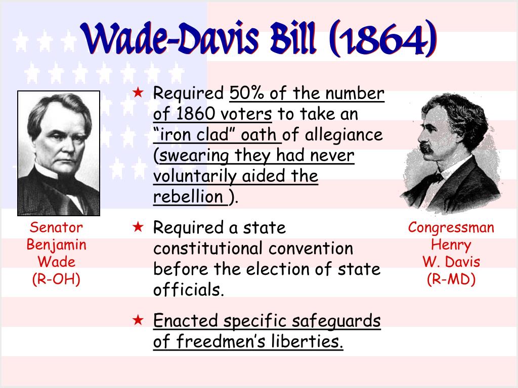 Wade-Davis Bill (1864) • Required 50% of the number of 1860 voters to take an “iron clad” oath of allegiance (swearing they had never voluntarily aided the rebellion ). • Required a state constitutional convention before the election of state officials. • Enacted specific safeguards of freedmen’s liberties. SenatorBenjaminWade(R-OH) CongressmanHenryW. Davis(R-MD)