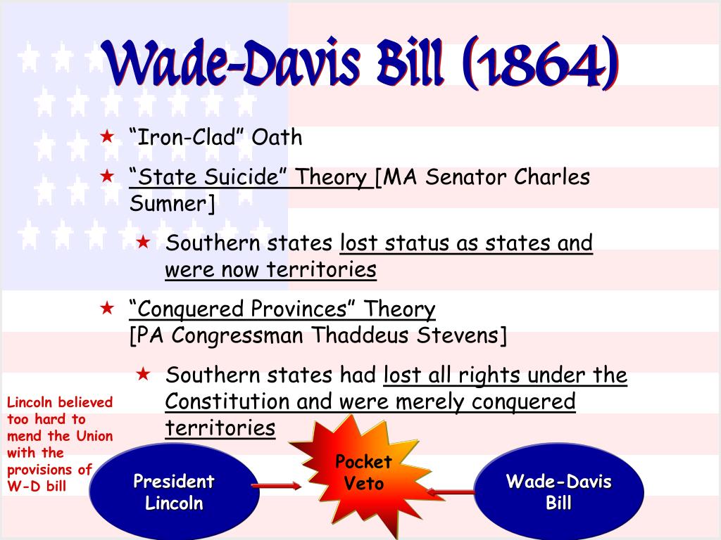 Wade-Davis Bill (1864) • “Iron-Clad” Oath • “State Suicide” Theory [MA Senator Charles Sumner] • Southern states lost status as states and were now territories • “Conquered Provinces” Theory[PA Congressman Thaddeus Stevens] • Southern states had lost all rights under the Constitution and were merely conquered territories Lincoln believed too hard to mend the Union with the provisions of W-D bill PocketVeto PresidentLincoln Wade-DavisBill