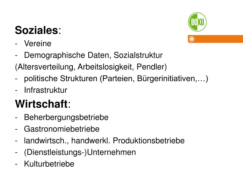 Soziales: • Vereine • Demographische Daten, Sozialstruktur (Altersverteilung, Arbeitslosigkeit, Pendler) • politische Strukturen (Parteien, Bürgerinitiativen,…) • Infrastruktur Wirtschaft: • Beherbergungsbetriebe • Gastronomiebetriebe • landwirtsch., handwerkl. Produktionsbetriebe • (Dienstleistungs-)Unternehmen • Kulturbetriebe