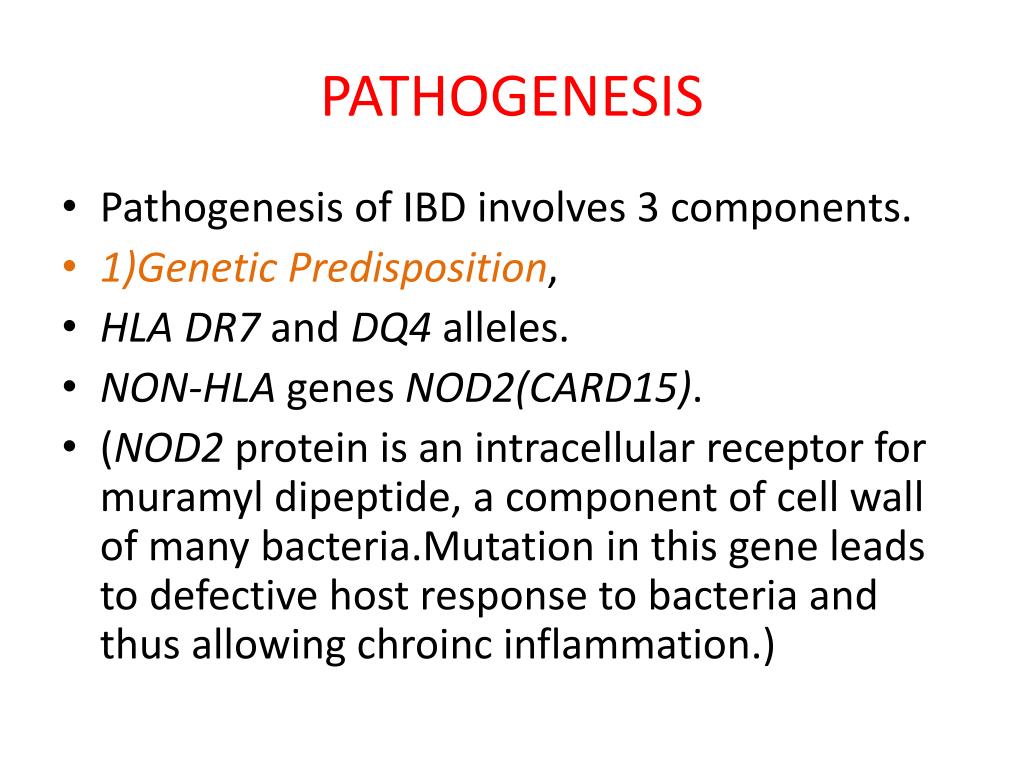 PATHOGENESIS • Pathogenesis of IBD involves 3 components. • 1)Genetic Predisposition, • HLA DR7 and DQ4 alleles. • NON-HLA genes NOD2(CARD15). • (NOD2 protein is an intracellular receptor for muramyldipeptide, a component of cell wall of many bacteria.Mutation in this gene leads to defective host response to bacteria and thus allowing chroinc inflammation.)