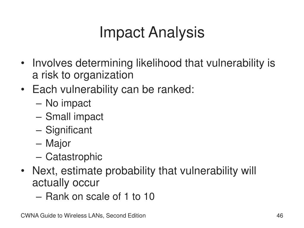 Impact Analysis • Involves determining likelihood that vulnerability is a risk to organization • Each vulnerability can be ranked: • No impact • Small impact • Significant • Major • Catastrophic • Next, estimate probability that vulnerability will actually occur • Rank on scale of 1 to 10 CWNA Guide to Wireless LANs, Second Edition