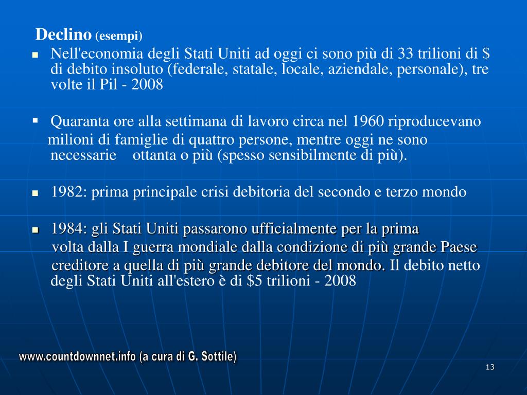 Declino (esempi) • Nell'economia degli Stati Uniti ad oggi ci sono più di 33 trilioni di $ di debito insoluto (federale, statale, locale, aziendale, personale), tre volte il Pil - 2008 • Quaranta ore alla settimana di lavoro circa nel 1960 riproducevano milioni di famiglie di quattro persone, mentre oggi ne sono necessarie ottanta o più (spesso sensibilmente di più). • 1982: prima principale crisi debitoria del secondo e terzo mondo • 1984: gli Stati Uniti passarono ufficialmente per la prima volta dalla I guerra mondiale dalla condizione di più grande Paese creditore a quella di più grande debitore del mondo. Il debito netto degli Stati Uniti all'estero è di $5 trilioni - 2008 www.countdownnet.info (a cura di G. Sottile)