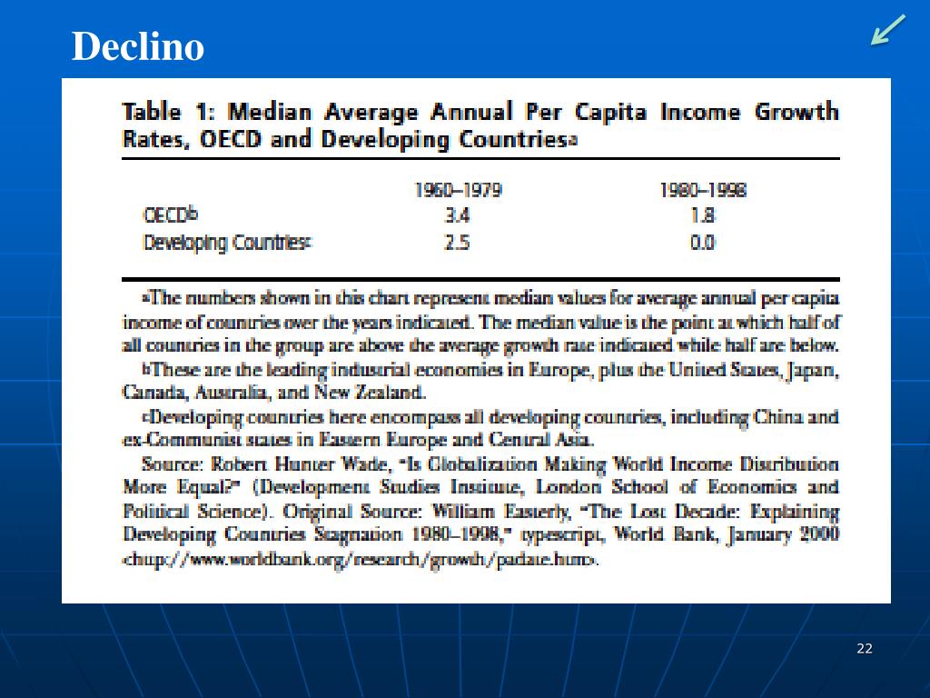 Declino • Secondo la World Bank il numero di poveri sul pianeta è di 2.81 miliardi. Secondo le Statistiche ufficiali, circa 40 milioni di americani vivono al di sotto della linea di povertà. • Cinque milioni di persone negli Stati Uniti saltano un pasto al giorno. Altri 5 milioni sono homeless. Solo il 5% dei cittadini americani possiede il 60% della ricchezza nazionale. Dal 1973 al 2003 il reddito medio delle famiglie americane crebbe meno di un terzo rispetto alla crescita della produttività • Nella Germania lo 0.5% della popolazione adulta possiede il 25.7% della ricchezza totale. Il 25% più povero delle famiglie tedesche non possiede alcuna risorsa monetaria(2003) e un milione e centomila bambini vive sotto la linea di povertà www.countdownnet.info (a cura di G. Sottile)