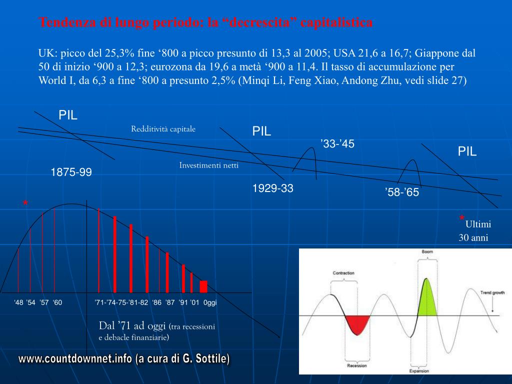 Tendenza di lungo periodo: la “decrescita” capitalistica UK: picco del 25,3% fine ‘800 a picco presunto di 13,3 al 2005; USA 21,6 a 16,7; Giappone dal 50 di inizio ‘900 a 12,3; eurozona da 19,6 a metà ‘900 a 11,4. Il tasso di accumulazione per World I, da 6,3 a fine ‘800 a presunto 2,5% (Minqi Li, Feng Xiao, Andong Zhu, vedi slide 27) PIL PIL Redditività capitale ’33-’45 PIL Investimenti netti 1875-99 1929-33 ’58-’65 * *Ultimi 30 anni ‘48 ’54 ’57 ‘60 ’71-’74-75-’81-82 ‘86 ’87 ’91 ’01 0ggi Dal ’71 adoggi (tra recessioni e debacle finanziarie) www.countdownnet.info (a cura di G. Sottile)