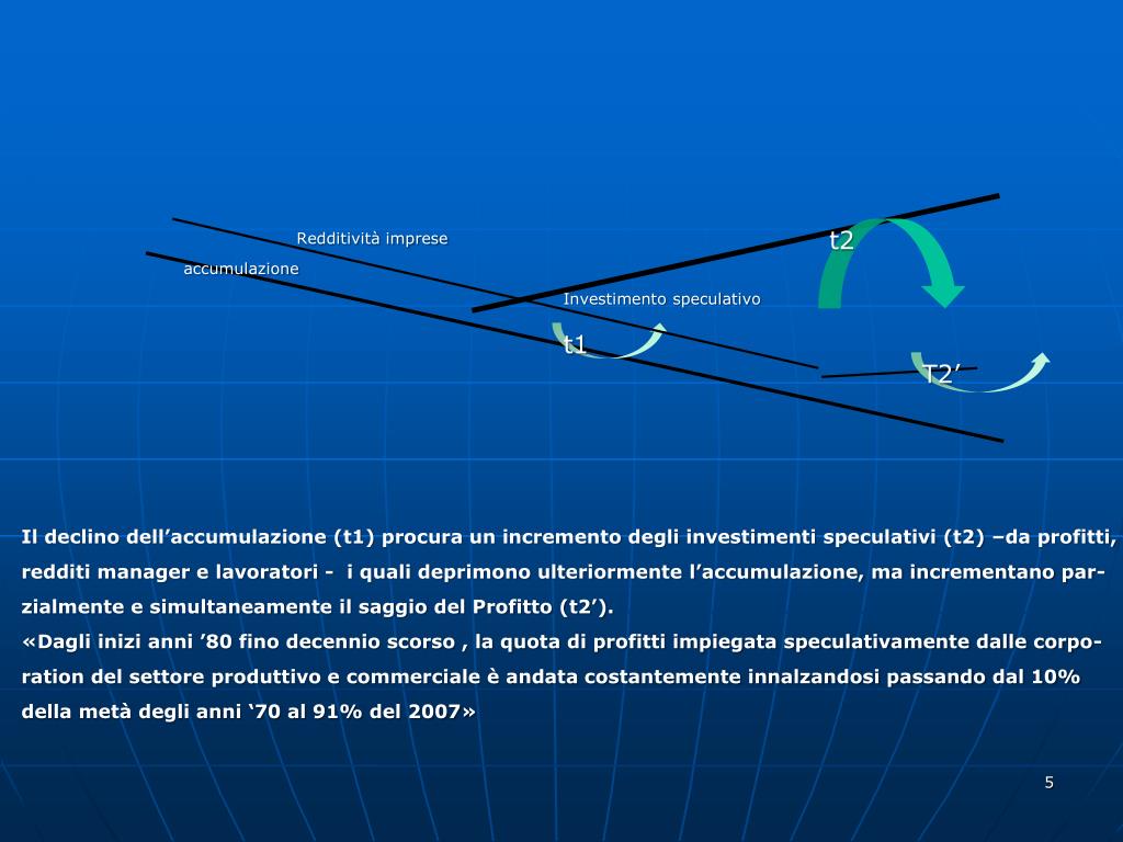t2 Redditività imprese accumulazione Investimento speculativo t1 T2’ Il declino dell’accumulazione (t1) procura un incremento degli investimenti speculativi (t2) –da profitti, redditi manager e lavoratori - i quali deprimono ulteriormente l’accumulazione, ma incrementano par- zialmente e simultaneamente il saggio del Profitto (t2’). «Dagli inizi anni ’80 fino decennio scorso , la quota di profitti impiegata speculativamente dalle corpo- ration del settore produttivo e commerciale è andata costantemente innalzandosi passando dal 10% della metà degli anni ‘70 al 91% del 2007»