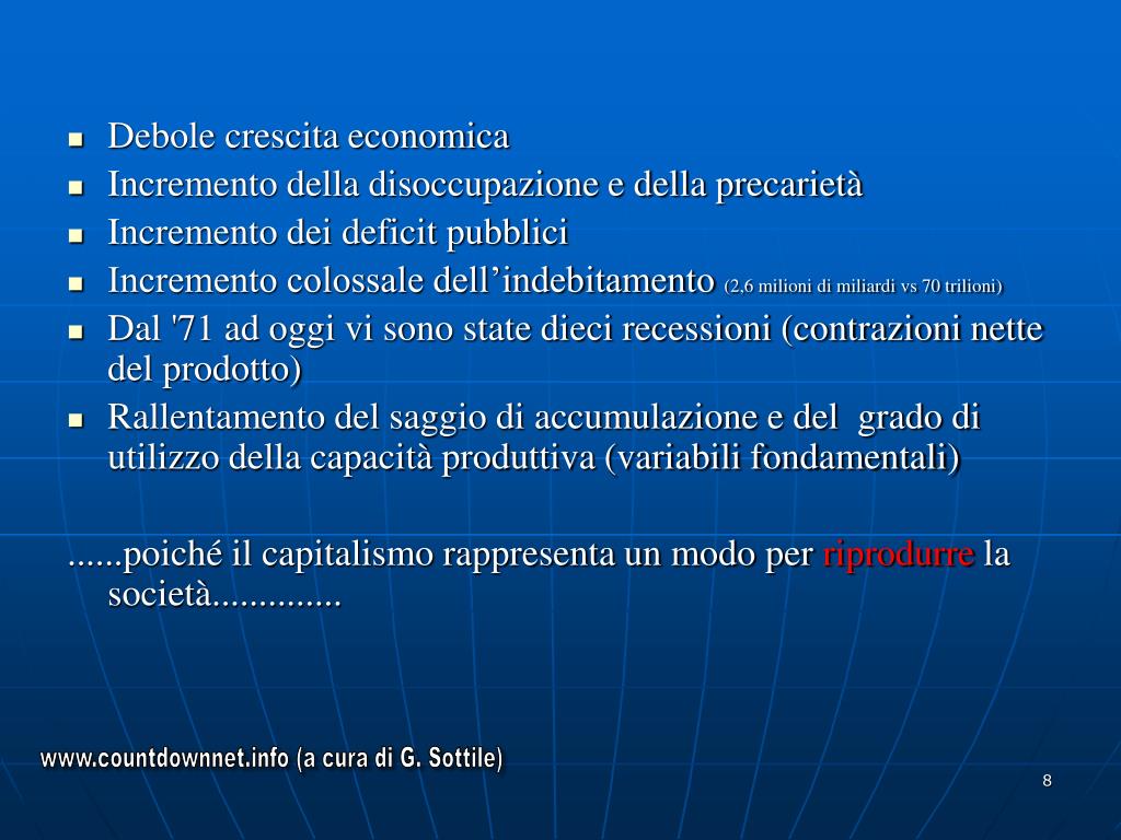 Debole crescita economica • Incremento della disoccupazione e della precarietà • Incremento dei deficit pubblici • Incremento colossale dell’indebitamento (2,6 milioni di miliardi vs 70 trilioni) • Dal '71 ad oggi vi sono state dieci recessioni (contrazioni nette del prodotto) • Rallentamento del saggio di accumulazione e del grado di utilizzo della capacità produttiva (variabili fondamentali) ......poiché il capitalismo rappresenta un modo per riprodurre la società.............. www.countdownnet.info (a cura di G. Sottile)
