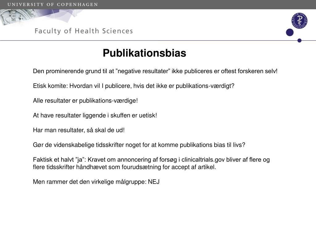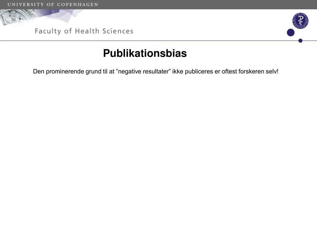 Publikationsbias Den prominerende grund til at ”negative resultater” ikke publiceres er oftest forskeren selv! Etisk komite: Hvordan vil I publicere, hvis det ikke er publikations-værdigt? Alle resultater er publikations-værdige! At have resultater liggende i skuffen er uetisk! Har man resultater, så skal de ud! Gør de videnskabelige tidsskrifter noget for at komme publikations bias til livs? Faktisk et halvt ”ja”: Kravet om annoncering af forsøg i clinicaltrials.gov bliver af flere og flere tidsskrifter håndhævet som fourudsætning for accept af artikel.