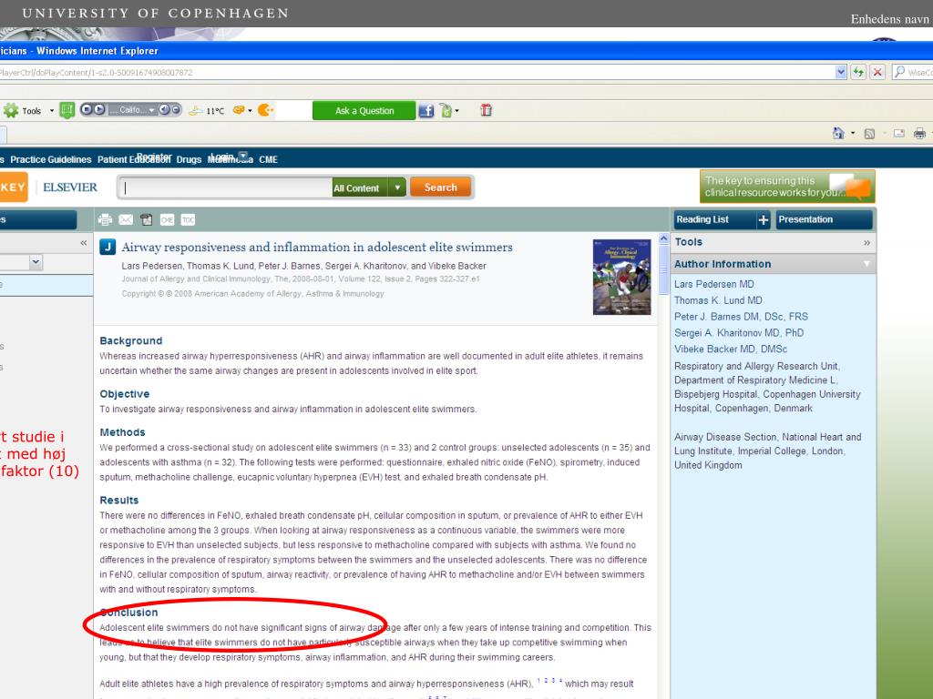 Kritisk Artikellæsning Diskussion: Forholder kollegerne sig kritisk og ydmygt ifht. resultaterne? Extreme conclusions requires extreme evidence! Er det foreneligt med andre studier? Hvis det er for godt til at være sandt...ja så er det såmænd nok ikke sandt! (”Kold fusion!”) Holder konklusionerne til et pato-fysiologisk ræsonnement? Diskuteres støj (confounders, bias, spredning)? Forvaltes signifikans, power oa. statistik fornuftigt (p=0.051 vs p=0.049)? Diskuteres primære endpoints og hypoteser eller ”kører det af sporet”? Behandles sekundære endpoints korrekt -dvs. hypotese-dannende – og ikke som primære fund?