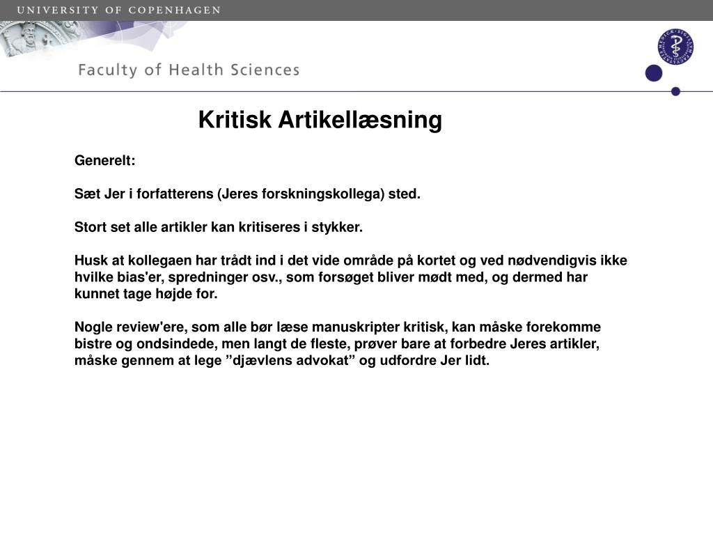 Kritisk Artikellæsning Generelt: Sæt Jer i forfatterens (Jeres forskningskollega) sted. Stort set alle artikler kan kritiseres i stykker. Husk at kollegaen har trådt ind i det vide område på kortet og ved nødvendigvis ikke hvilke bias'er, spredninger osv., som forsøget bliver mødt med, og dermed har kunnet tage højde for. Nogle review'ere, som alle bør læse manuskripter kritisk, kan måske forekomme bistre og ondsindede, men langt de fleste, prøver bare at forbedre Jeres artikler, måske gennem at lege ”djævlens advokat” og udfordre Jer lidt.