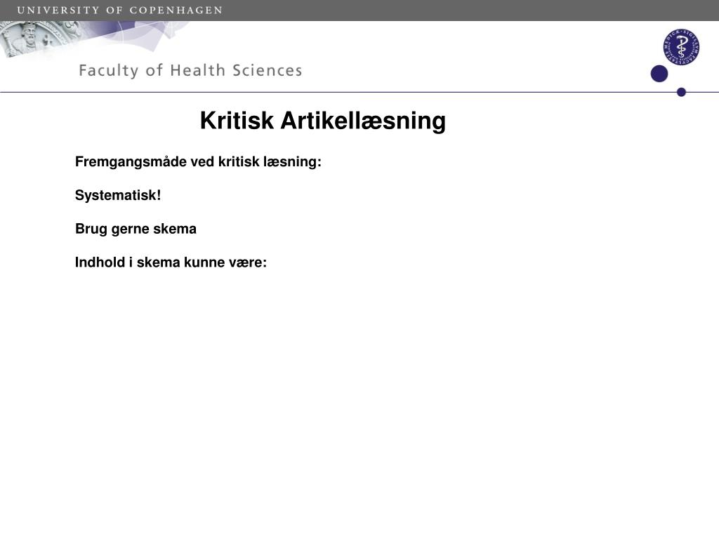 Kritisk Artikellæsning Fremgangsmåde ved kritisk læsning: Systematisk! Brug gerne skema Indhold i skema kunne være: