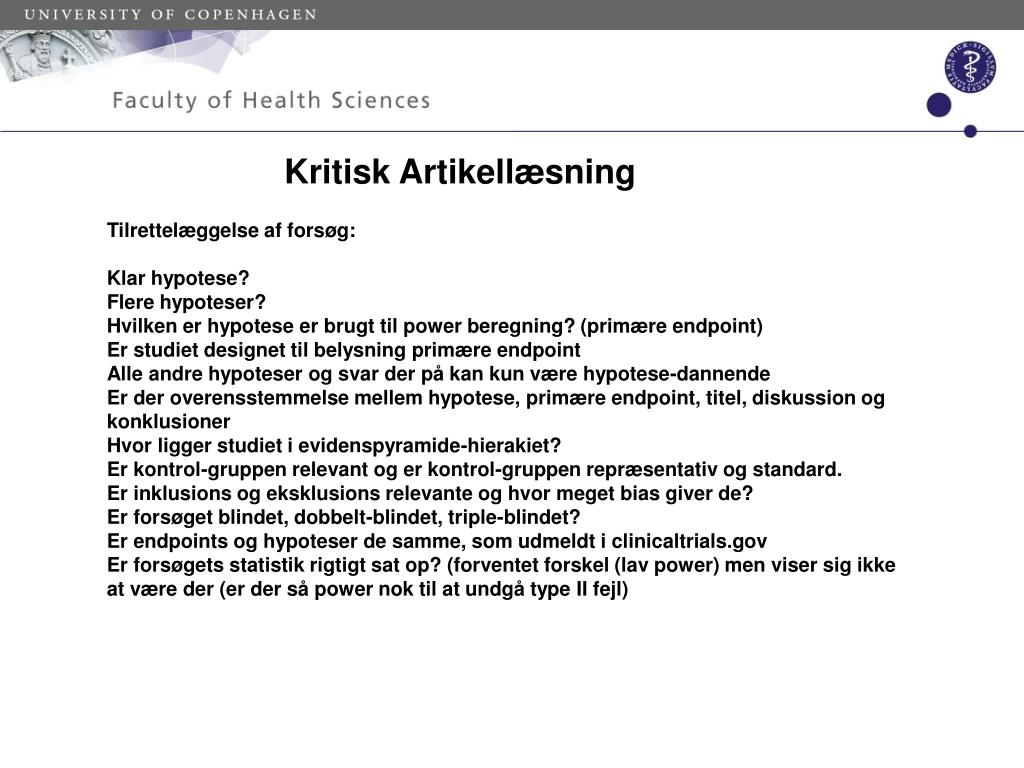 Kritisk Artikellæsning Tilrettelæggelse af forsøg: Klar hypotese? Flere hypoteser? Hvilken er hypotese er brugt til power beregning? (primære endpoint) Er studiet designet til belysning primære endpoint Alle andre hypoteser og svar der på kan kun være hypotese-dannende Er der overensstemmelse mellem hypotese, primære endpoint, titel, diskussion og konklusioner Hvor ligger studiet i evidenspyramide-hierakiet? Er kontrol-gruppen relevant og er kontrol-gruppen repræsentativ og standard. Er inklusions og eksklusions relevante og hvor meget bias giver de? Er forsøget blindet, dobbelt-blindet, triple-blindet? Er endpoints og hypoteser de samme, som udmeldt i clinicaltrials.gov Er forsøgets statistik rigtigt sat op? (forventet forskel (lav power) men viser sig ikke at være der (er der så power nok til at undgå type II fejl)
