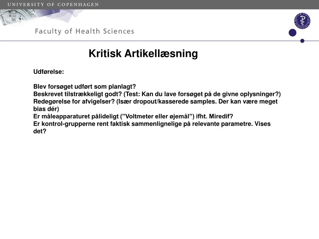 Kritisk Artikellæsning Udførelse: Blev forsøget udført som planlagt? Beskrevet tilstrækkeligt godt? (Test: Kan du lave forsøget på de givne oplysninger?) Redegørelse for afvigelser? (Især dropout/kasserede samples. Der kan være meget bias dér) Er måleapparaturet pålideligt (”Voltmeter eller øjemål”) ifht. Miredif? Er kontrol-grupperne rent faktisk sammenlignelige på relevante parametre. Vises det?