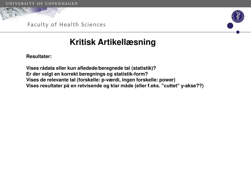Kritisk Artikellæsning Resultater: Vises rådata eller kun afledede/beregnede tal (statistik)? Er der valgt en korrekt beregnings og statistik-form? Vises de relevante tal (forskelle: p-værdi, ingen forskelle: power) Vises resultater på en retvisende og klar måde (eller f.eks. ”cuttet” y-akse??)