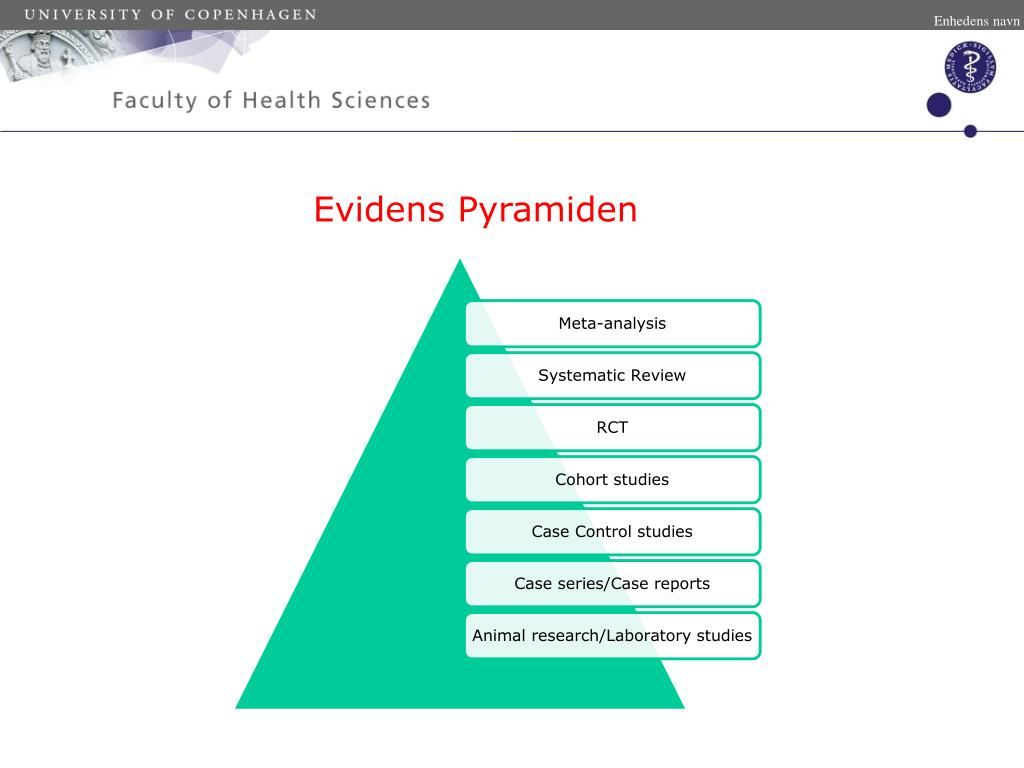 Enhedens navn Evidens pyramiden • Cohort studies: Større populations undersøgelser. Observationelle studier, kombineret med en gruppe som ikke er “smittet” eller behandlet. Adskiller sig fra RCT ved at de 2 grupper ikke er randomiserede, og derfor kan være forskellige på enkelte/flere punkter. • Case control studier: Patienter som allerede er syge med en bestemt sygdom, analyseres I forhold til personer uden denne lidelse (kontrol gruppe). Det er ofte baseret på Journal optagelser. • Case series: Individuelle patienter. Ingen kontrol gruppe.