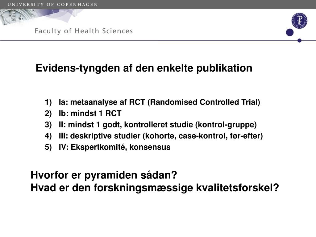 Evidens-tyngden af den enkelte publikation Ia: metaanalyse af RCT (Randomised Controlled Trial) Ib: mindst 1 RCT II: mindst 1 godt, kontrolleret studie (kontrol-gruppe) III: deskriptive studier (kohorte, case-kontrol, før-efter) IV: Ekspertkomité, konsensus Hvorfor er pyramiden sådan? Hvad er den forskningsmæssige kvalitetsforskel?