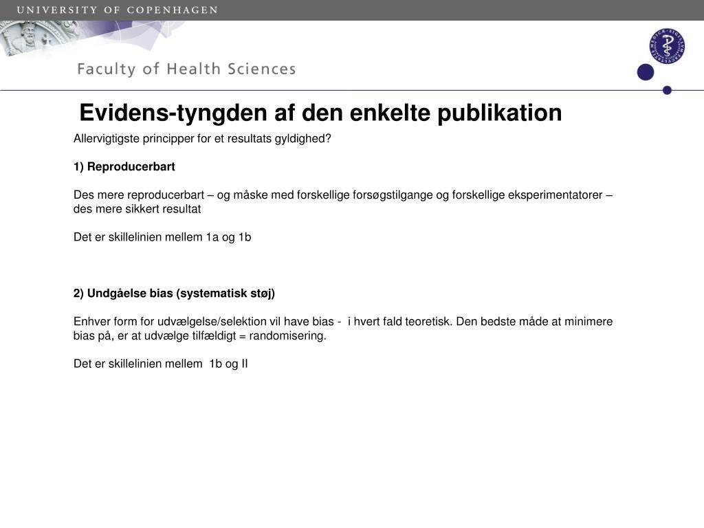 Evidens-tyngden af den enkelte publikation Allervigtigste principper for et resultats gyldighed? 1) Reproducerbart Des mere reproducerbart – og måske med forskellige forsøgstilgange og forskellige eksperimentatorer – des mere sikkert resultat Det er skillelinien mellem 1a og 1b 2) Undgåelse bias (systematisk støj) Enhver form for udvælgelse/selektion vil have bias - i hvert fald teoretisk. Den bedste måde at minimere bias på, er at udvælge tilfældigt = randomisering. Det er skillelinien mellem 1b og II
