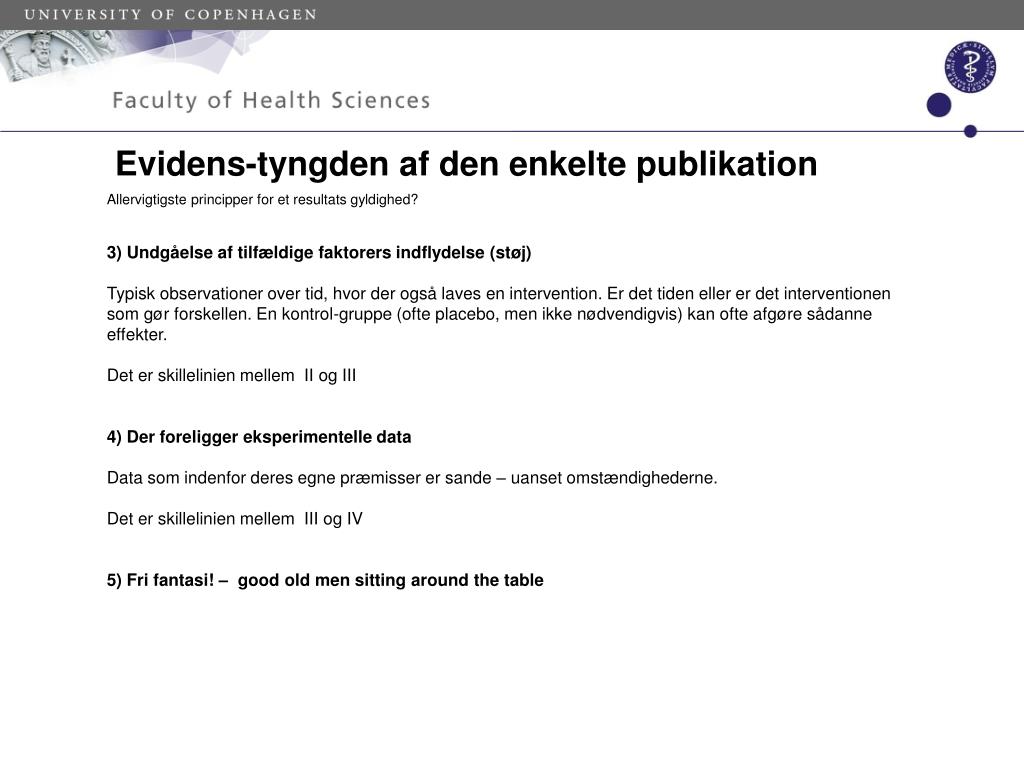Evidens-tyngden af den enkelte publikation Allervigtigste principper for et resultats gyldighed? 3) Undgåelse af tilfældige faktorers indflydelse (støj) Typisk observationer over tid, hvor der også laves en intervention. Er det tiden eller er det interventionen som gør forskellen. En kontrol-gruppe (ofte placebo, men ikke nødvendigvis) kan ofte afgøre sådanne effekter. Det er skillelinien mellem II og III 4) Der foreligger eksperimentelle data Data som indenfor deres egne præmisser er sande – uanset omstændighederne. Det er skillelinien mellem III og IV 5) Fri fantasi! – good old men sitting around the table