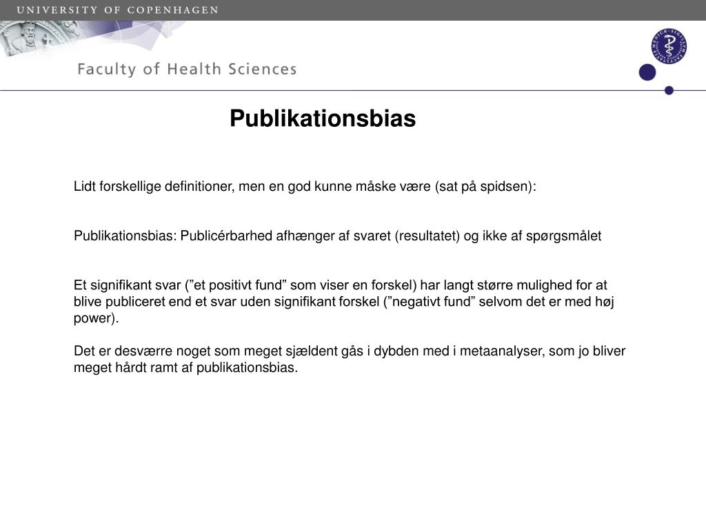 Publikationsbias Lidt forskellige definitioner, men en god kunne måske være (sat på spidsen): Publikationsbias: Publicérbarhed afhænger af svaret (resultatet) og ikke af spørgsmålet Et signifikant svar (”et positivt fund” som viser en forskel) har langt større mulighed for at blive publiceret end et svar uden signifikant forskel (”negativt fund” selvom det er med høj power). Det er desværre noget som meget sjældent gås i dybden med i metaanalyser, som jo bliver meget hårdt ramt af publikationsbias.