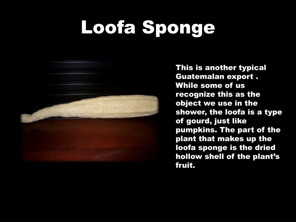 Loofa Sponge This is another typical Guatemalan export . While some of us recognize this as the object we use in the shower, the loofa is a type of gourd, just like pumpkins. The part of the plant that makes up the loofa sponge is the dried hollow shell of the plant’s fruit.