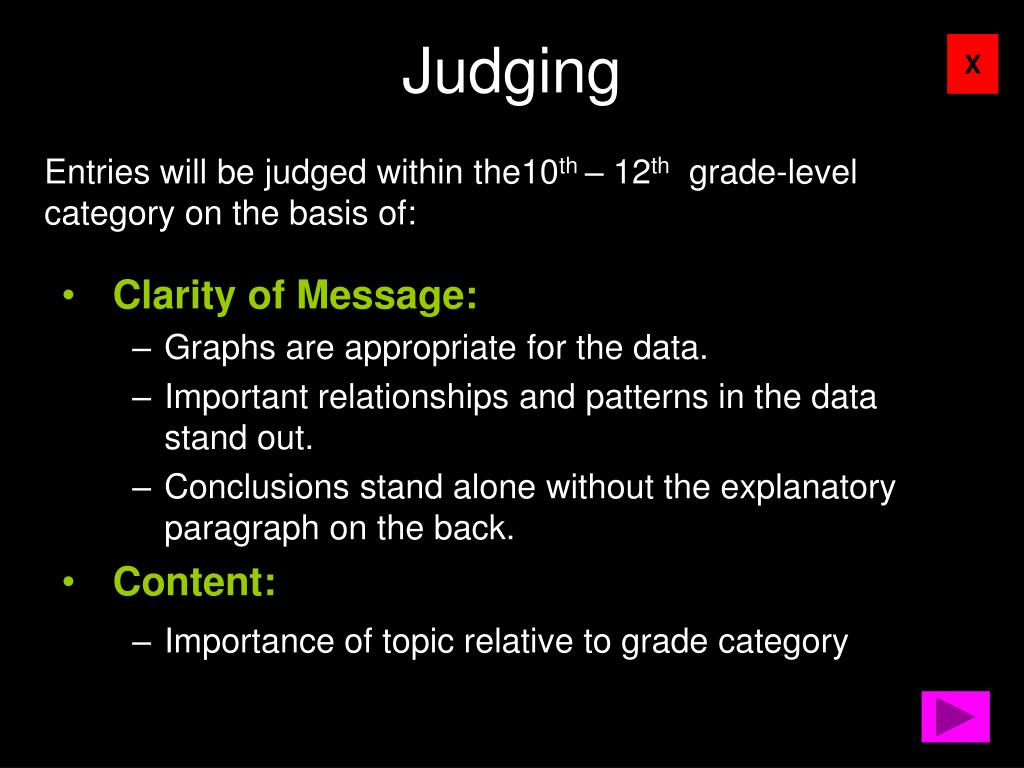 Judging Entries will be judged within the10th – 12th grade-level category on the basis of: • Clarity of Message: • Graphs are appropriate for the data. • Important relationships and patterns in the data stand out. • Conclusions stand alone without the explanatory paragraph on the back. • Content: • Importance of topic relative to grade category