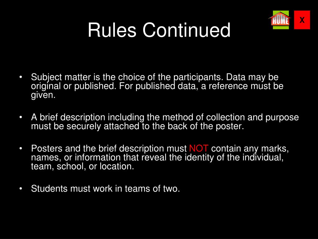 Rules Continued • Subject matter is the choice of the participants. Data may be original or published. For published data, a reference must be given. • A brief description including the method of collection and purpose must be securely attached to the back of the poster. • Posters and the brief description must NOT contain any marks, names, or information that reveal the identity of the individual, team, school, or location. • Students must work in teams of two.